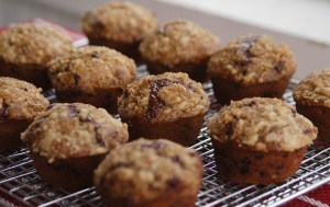 To make the bulk muffin mix you’ll need a large bag of flour, a bag of sugar, a couple of cups of soy milk powder and a few other ingredients; a large bowl in which to mix all the ingredients; and a dozen heavy-duty ziplock bags (write ‘Muffin mix’ on them, and reuse for future muffin mixes!). To make the muffins, I’d recommend you get some paper muffin cups, a stainless steel muffin tin (Teflon is bad for you); cooking spray, like PAM; and a coffee grinder for the flax seed. Keep about a cup of ground flax seed in the fridge for when you want to make muffins.