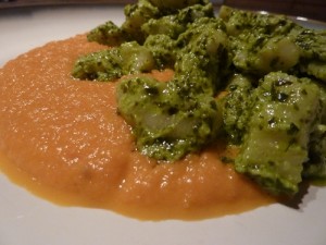 I decided to do a three course meal of all original recipes: Spicy Peanut Soup, Gnocchi with Pesto and Rich and Pretty Sauce, and _________ ________ ________ cake with _________ ________.
