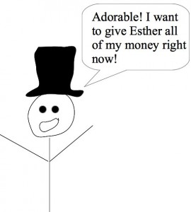 6) Signs and decorations: I’m thinking a big poster of Esther with a synopsis of her “story” plus some leaflets about Esther and her indiegogo campaign. What else…? A sign saying “Ask me about Esther the Wonder Pig”? Pink tablecloths? Pink balloons? I’m not particularly artistic, so I’ll happily defer to whoever volunteers for this task. And it’s an important one. The sale might make $1000 or so, but a single generous donor – enlightened by our leaflet and charmed by our piggy decor – could beat that with the click of a mouse button.