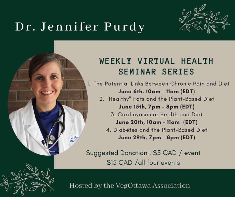 Every week in June, VegOttawa Association will be hosting one of a four-week series about health issues and the benefits of a plant-based diet presented by Dr. Jennifer Purdy.