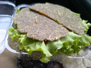 Yves chose the Om Burger, which is mushroom based. He often chooses mushroom-y things when we eat out, because I loathe them and never use them at home. Its bun was a mash of dehydrated seeds and vegetables, which he was not keen on, but other than that, he was pretty pleased.