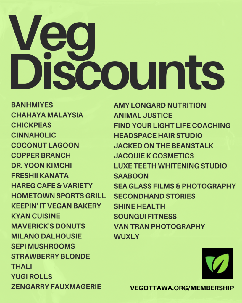 If you’re not a VegOttawa Association member yet, sign up today to enjoy discounts at more than 35 local vegan-friendly businesses. Your membership also supports our non-profit organization’s mission to support, inspire and promote vegan lifestyle, community and business in Ottawa.