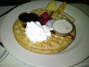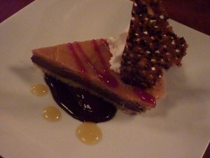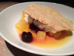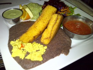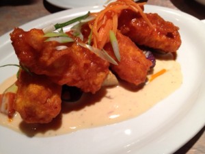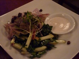 Chef Caroline surprised us with a three-course pub-style plated dinner. The first course was apple slaw with a breaded butternut squash risotto ball, followed by the entrée, which was a platter of goodies including panko-crusted onion rings, BBQ seitan fingers, salad rolls, kale chips, tofu dengaku with miso apple butter glaze, and a box of french fries for each participant! As if that wasn’t enough, dessert came in the form of a decadent brownie topped with ice cream, coconut whipped cream, and chocolate sauce.