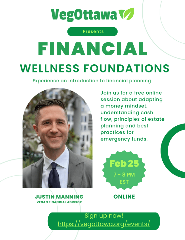 If one of your goals for 2026 is to get a better handle on your finances, this event is for you! Join VegOttawa for an engaging introduction to financial planning, hosted by vegan financial advisor Justin Manning. This free online session will explore how to develop a healthy money mindset, gain clarity around your cash flow, and build confidence in your financial decisions. We’ll also cover the core principles of estate planning and share practical best practices for creating and maintaining a strong emergency fund. Justin has also kindly offered to provide all registrants with a free will!