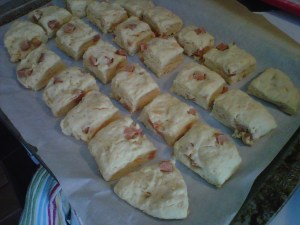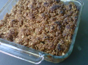 In a medium sized bowl, cream half a cup of vegan margarine (I use Earth Balance or Becel Vegan) with 3/4 cup of brown sugar. Add 1/2 cup of flour (I use spelt). Add 1 tsp. cinnamon. Mix in 1 cup of oats.